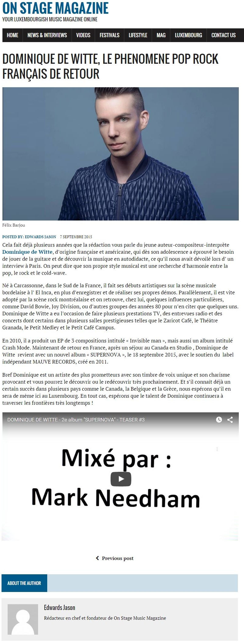 Lien vers l'article : http://onstagemag.eu/2015/09/07/dominique-de-witte-le-phenomene-pop-rock-francais-de-retour/